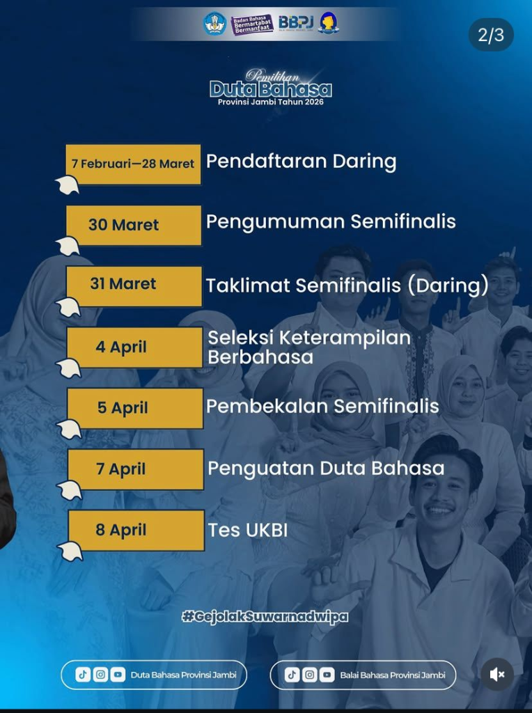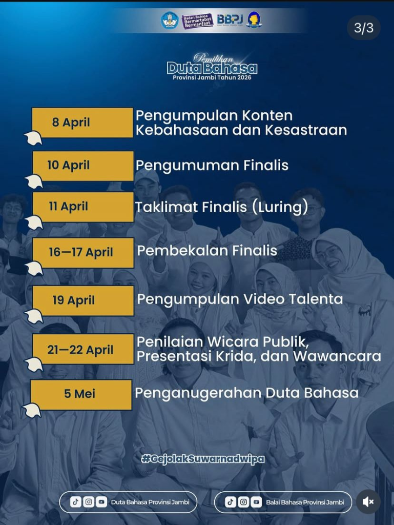 Puncak penganugerahan dari kegiatan pemilihan duta bahasa Provinsi Jambi tahun 2026 akan diselenggarakan pada tanggal 05 Mei 2026 yang bertempat di Kantor Bahasa Provinsi Jambi