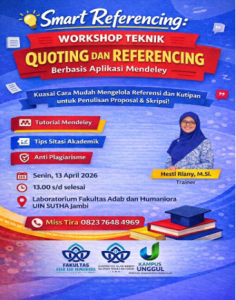 Senin, 13 April 2026 Fakultas Adab dan Humaniora mengadakan pelatihan menulis bagi mahasiswa dengan tema Smart Referencing: Workshop Teknik Quoting and Referencing Berbasis Aplikasi Mendeley, bertempat di Gedung Laboratorium dan Perpustakaan Fakultas Adab dan Humaniora UIN Sulthan Thaha Saifuddin Jambi. Kegiatan ini diikuti oleh mahasiswa Semester VI sebagai peserta dari
